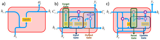 Diagrams of AI models (a) recurrent neural network (RNN), (b) long short-term memory (LSTM), (c) gated recurrent unit (GRU).