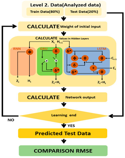 In recent years, machine learning has driven advances in many different fields [12,13,14]. The process of predicting the sensory data is used not only for securing reliability of the existing data and defining the cause of faults that had already occurred also in forecasting future to detect the user’s risk in advance. Among the AI models, mainly RNN, LSTM, and GRU are widely used. This tendency is due to the proven stability compared to other AI models [15,16]. These models’ working mechanism is shown as a diagram in Figure 2.