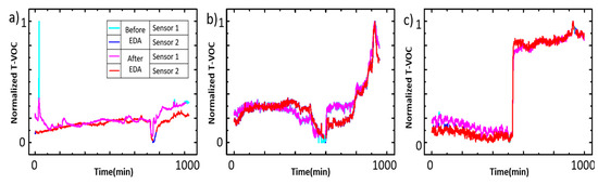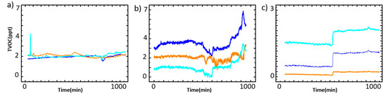Raw data from the TVOC sensor groups: (a) CONSTANT situation, (b) EVENT 1: increasing TVOC rate at 1.45 ppt/min, (c) EVENT 2: increasing TVOC rate at 10.02 ppt/min. Each line color indicates each sensor.