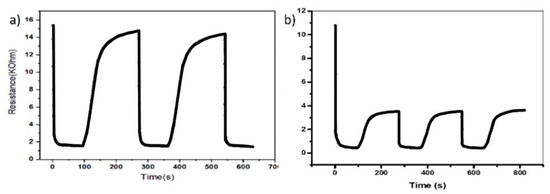 Result of sensor reliability test: (a) resistance of sensing element changes with an injection of 1 ppm of acetone, (b) resistance of the sensing element change with an injection of 10 ppm of acetone.