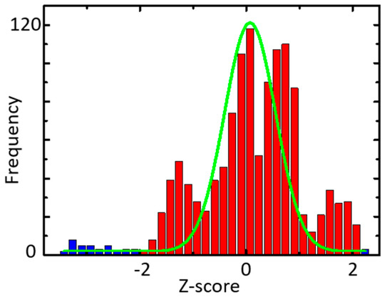 For example, as shown in Figure 6, in CONSTANT-Sensor 1 (blue bar in Figure 4), the histogram of the Z-score shows 3.07% outliers, centering on the PFCM, as shown in Table 2. This process was repeated on each sensor in every situation, as shown in Figure 7, while K-means or PFCM was chosen depending on the accuracy of the clustering.