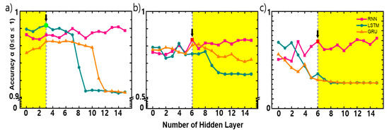 Previously, it has been shown empirically that the best performance of a neural network is when the number of hidden nodes is log (T), where T is the number of training samples [31]. This principal is also partly observed in this study in whole situations, LSTM and GRU give better performance with less than three hidden layers. However, RNN shows comparatively stable accuracy with change (increase) of number of hidden layers and miner linearity is shown.