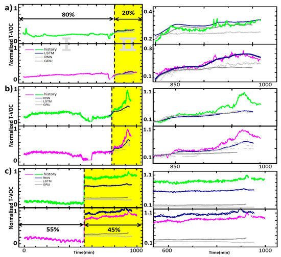 In this study, through a delicate selection of scenarios corresponding to major aspects of ICT TVOC (total volatile organic compound) sensors, a suggestion of analysis methods for each situation, as well as a comparison of the predictive data from RNN, LSTM, and GRU, is performed. The use of this framework of analysis and prediction provides a proper guide for treating and predicting ICT TVOC sensory data to avoid system shutdown and to increase work efficiency through economic processes such as air circulation/ventilation and pollutant removal.