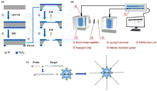 Schematic illustrations of (a) the nanopore fabrication process, (b) the nanopore-based detection setup and (c) the process of DNA selectively binding to the microbead.