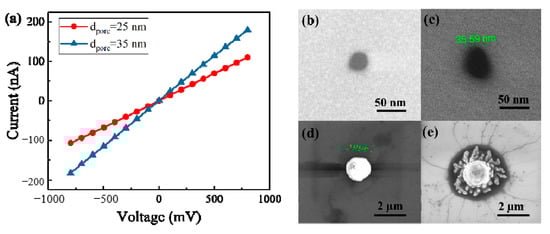 (a) Current–voltage curves for nanopores with diameters of 25 nm and 35 nm in 1M KCl solution; (b) and (c) SEM images of nanopores with diameters of approximately 26 nm and 36 nm; (d) SEM image of a polystyrene bead; (e) SEM image of a polystyrene bead after incubating with DNA–probe complexes.