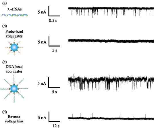 Ionic current traces for (a) λ-DNAs, (b) probe–bead conjugates and (c) DNA–bead conjugates; (d) ionic current trace measured under reversed the bias voltage.