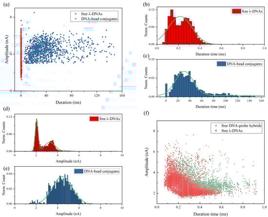 (a) Scatter plots of signal duration time versus amplitude for free λ-DNAs and DNA–bead conjugates; duration time distributions for (b) free λ-DNAs and (c) DNA–bead conjugates with Gaussian fits; amplitude distributions for (d) free λ-DNAs and (e) DNA–bead conjugates with Gaussian fits; (f) scatter plots of signal duration time versus amplitude for free λ-DNAs detected by using a 35 nm diameter nanopore and free DNA–probe hybrids detected by using a 25 nm diameter nanopore.