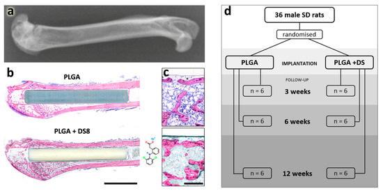 Experimental setup. (a) Experiments were conducted in the femur of rats: X-ray illustrating the anatomical region. (b) Poly(lactide-co-glycolide) (PLGA) and PLGA+DS8 rods were implanted in the femoral shaft via a drill hole created in the intercondylar space of the femur. Scale bar, 5 mm. (c) Magnified images of new bone formation in (b), scale bar, 300 µm. (d) illustrates the experimental setup: number of rats assigned to PLGA and PLGA+DS8 groups and respective follow-up periods.