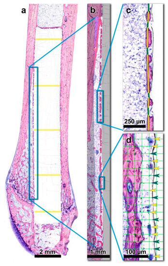 For histomorphometric analysis, the digitized sections were further processed with Adobe Photoshop® (CS5, Adobe, San Jose, CA, USA). Originally, two regions of interest (ROIs) were set alongside the anterior and posterior bone-implant interface (Figure 2a). Therefore, a rectangular field with the predefined width of 332.5 µm was positioned in the longitudinal direction of the femoral shaft, adjacent to the outer anterior and posterior surface of the PLGA rod, respectively. The length of the rectangles differed depending on the actual position of the PLGA implant within each individual femur. Distally, the ROI was bounded by the cartilaginous epiphysis of the distal femur. Proximally, the endpoint of the ROI was determined as the point where no newly formed peri-implant bone layer was interspersed between the implant and the old compact bone of the femoral shaft. Proximal to this point, the implant is enclosed by the cortex of the diaphysis only. In other words, the transition of the medullary space into the cortex of the diaphysis within the 332.5 µm high rectangle represented the proximal boundary of the ROI (Figure 2a). Based on this definition, the anterior ROI was easily standardizable. However, the posterior region was too irregular and inconsistent to allow for the accurate, commensurable histomorphometric measurement. To avoid bias, only the anterior ROI was measured (and hereinafter referred to as ROI).