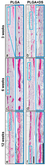 In several samples, numerous cracks in the embedded implants and occasionally also at the implant-to-tissue intersection were visible. These cracks most probably originate from strain in the PLGA/PLGA+DS8 rods occurring during the specimen preparation process and did not impede the histomorphometric evaluation of the samples.