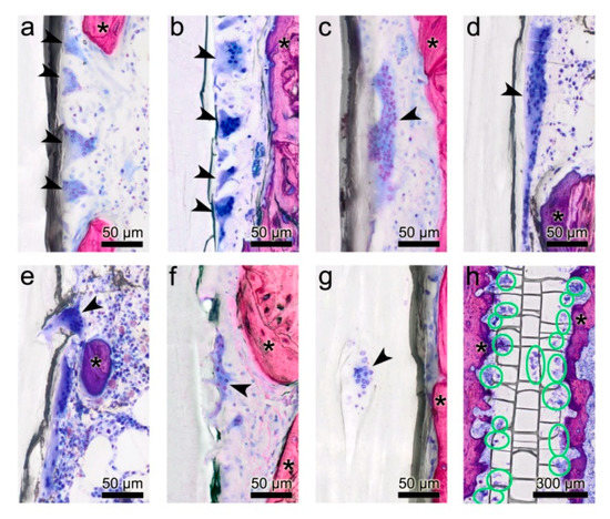 Morphological diversity of multinucleated giant cells (MGCs). (a–d) MGCs of various shape, size, numbers of nuclei and different staining intensities adhere to the surface of the poly(lactide-co-glycolide) (PLGA) implant in both, the PLGA and PLGA+DS8 groups. (d) Large MGC with a length of 270 µm. (e,f) MGCs submerge into the PLGA implant by extruding filopodia. (g) MGC located in a lacuna within the PLGA implant. (h) Overview section parallel to the midsagittal plane of a PLGA implant illustrating the location and activity of MGCs below the surface of a PLGA+DS8 rod 6 weeks after surgery (green circles indicate MGCS). Arrowheads point to multinucleated giant cells; Asterisks indicate bone.
