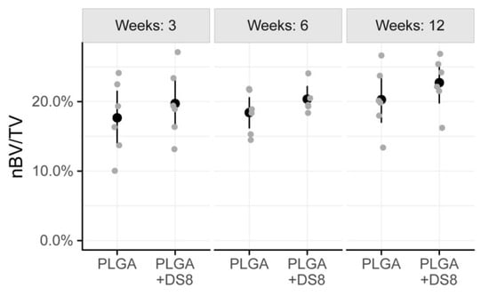 There was a slight increase of nBV/TV over time, in both PLGA and the PLGA+DS8 groups. However, the time-dependent changes were not statistically different for the PLGA group and the PLGA+DS8 group (p = 0.196). There was no statistically significant difference in nBV/TV between the PLGA and the PLGA+DS8 groups at any time point (p = 0.167).