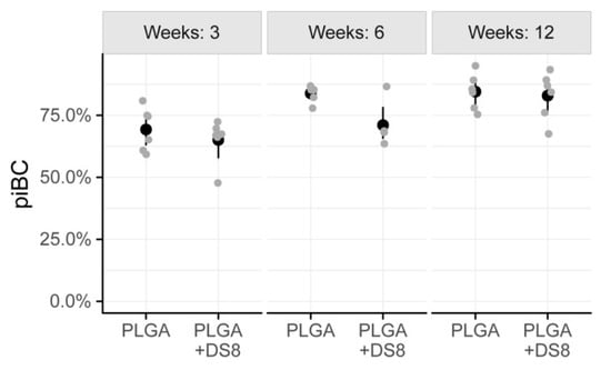 In both the PLGA and the PLGA+DS8 groups, piBC significantly increased over time (p < 0.001). A more detailed comparison of the differences between the time points analyzed is listed in Table 1. In addition, there was a significant difference in piBC between the PLGA and the PLGA+DS8 groups (p = 0.03); however, post hoc tests revealed that no significant difference exists in concrete comparisons.