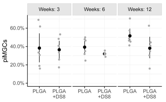 In the PLGA groups, piMGCs tended to increase over time from 38.3% to 51.6%, whereas it remained rather constant around 38% in the PLGA+DS8 groups. However, this time-dependent change was not statistically significant (p = 0.212), probably due to the high variation and the low number of specimens. Likewise, the differences between the groups were not statistically significant at any time point (p = 0.097).