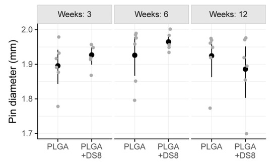 The mean diameter of the PLGA rods -being a measure for structural integrity or degradation- ranged from 1.89 mm to 1.97 mm. In detail, after 3 weeks I.DM was 1.90 mm (SD 0.07) in the PLGA group and 1.93 mm (SD 0.03) in the PLGA+DS8 group. After 6 weeks, I.DM was 1.93 mm (SD 0.08) and 1.96 mm (SD 0.02), and after 12 weeks, 1.92 mm (SD 0.08) and 1.89 mm (SD 0.10) in the PLGA and the PLGA+DS8 group, respectively (Figure 8).