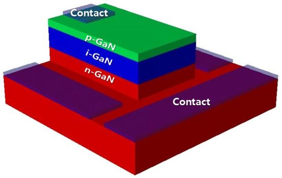 Figure 1 shows the 3-D schematic of the GaN-based p-i-n diode for BV cells. The p-i-n diode structure is the conventional diode structure, which consisted of an intrinsic GaN (i-GaN) region between p-type GaN (p-GaN) and n-type GaN (n-GaN) regions to obtain a wide width in the depletion region. The Di-GaN determines the depletion width, which affects the conversion efficiency for BV cells. Here, i-GaN denotes undoped GaN, which is almost an n-type due to the residual donor [21]. The background impurity concentration in undoped GaN grown by metal-organic chemical-vapor deposition (MOCVD) is typically in the range of 1015 to 1017 cm−3, depending on the condition of the reactor [22]. Furthermore, it is difficult to grow undoped GaN with simultaneous low doping concentration and high quality [23]. Thus, the Di-GaN was varied in the range of 5 × 1015 cm−3 to 5 × 1016 cm−3 for optimizing the Di-GaN. In order to reduce the resistance of the n-GaN and p-GaN layers, doping concentrations of the n-GaN and p-GaN (Dn-GaN and Dp-GaN) were designed as 5 × 1018 cm−3 and 5 × 1017 cm−3, respectively. We also changed the Hp-GaN and Hi-GaN to achieve high performance. The variation ranges of Hp-GaN and Hi-GaN were 60–200 nm and 500–900 nm, respectively. The ranges of Hp-GaN and Hi-GaN values were determined by considering the penetration depth of 17 keV electrons at about 1 μm [24]. The energy of the e-beam is the average energy of 63Ni [25,26]. The contact resistance for p-GaN and n-GaN in the devices was 1 × 10−4 Ω·cm2 [27,28].
