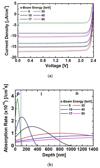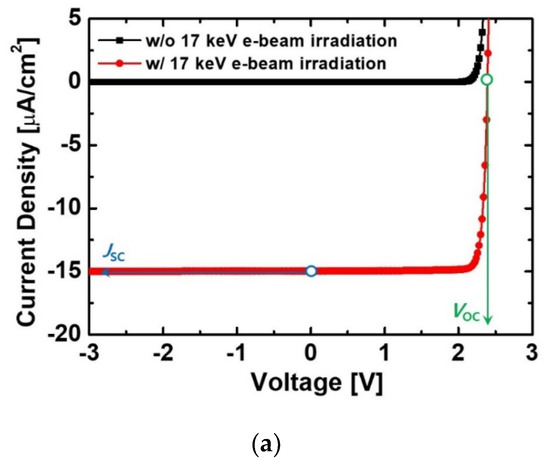 Figure 2a shows the effects of e-beam irradiation on the reverse current characteristics of the GaN p-i-n diode. When the diode was irradiated by a 17 keV e-beam, the reverse current density significantly increased. This was because electron-hole pairs (EHPs) were generated by the injected high-energy electrons. The electrons and holes in the depletion region were respectively moved by internal electric field through n-GaN and p-GaN regions and the carriers converted to the electric current. The JSC and a VOC of the irradiated diode were 14.92 μA/cm2 and 2.391 V, respectively. The JSC and VOC were defined as the current density at a voltage of 0 V and the voltage when the current density was 0 A/cm2, respectively.