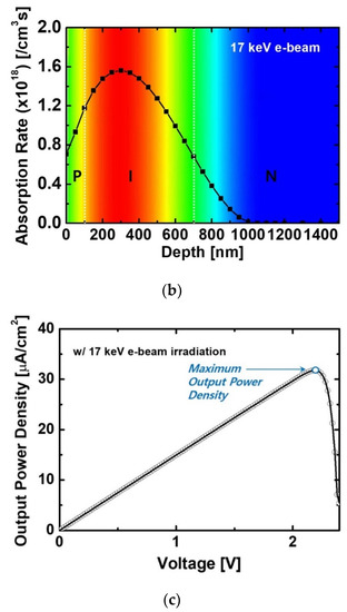 As shown in Figure 2b, the 17 keV electrons penetrated up to a depth of about 1 μm and the peak absorption rate was exhibited at a depth of about 300 nm. Because many EHPs generated in the i-GaN region contributed to the conversion efficiency, the Hi-GaN and Di-GaN are important design parameters. A high conversion efficiency increases JSC and VOC, which influences the output power density (Pout). The diode exhibited the maximum Pout (Pout_max) at a voltage of 2.18 V, as shown in Figure 2c.