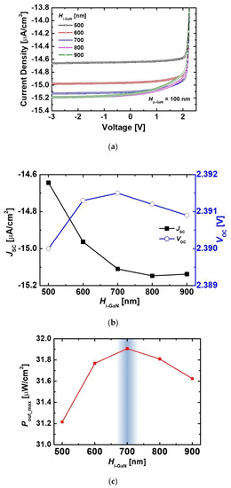 Figure 3a shows the variations of the reverse current characteristics of the irradiation diodes as a function of Hi-GaN. As the Hi-GaN increased, the reverse current density became higher due to extension of the absorption region. Many EHPs were generated in the extended absorption region, which converted the electric current. However, the current density of the diodes with a Hi-GaN above 900 nm was lower than that of the device with a Hi-GaN of 700 nm at a forward voltage above 0 V. This result indicated that excess carriers generated by the e-beam were reduced by the recombination mechanism as they moved through the n-GaN or p-GaN regions. This result affected the VOC and JSC of the diodes. As shown in Figure 3b, the device with a Hi-GaN of 700 nm had the highest VOC. In terms of Pout_max, the device with a Hi-GaN of 700 nm exhibited the highest Pout_max because the device was less affected by the recombination phenomenon, as shown in Figure 3c.