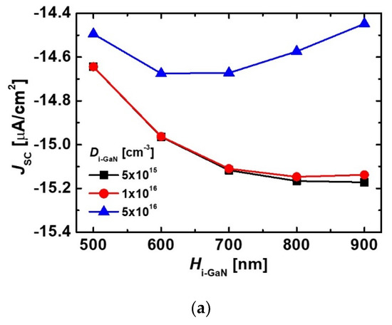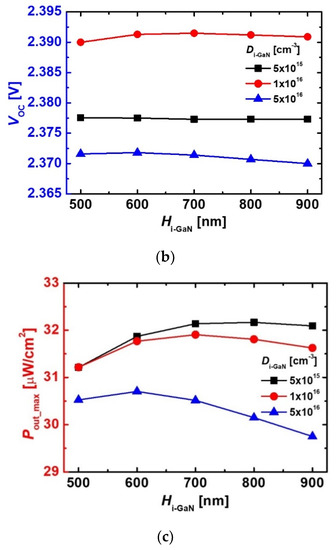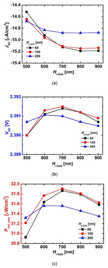 The variations of JSC, VOC, and Pout_max depending on the Hi-GaN and Hp-GaN are shown in Figure 4. The JSC of the devices increased with a rise in the Hi-GaN regardless of the Hp-GaN because a high Hi-GaN extended the absorption region. When the Hi-GaN above 800 nm increased, the JSC slightly decreased due to the recombination phenomenon. As the Hp-GaN became shorter, the variation of JSC according to the Hi-GaN increased. This result indicated that the absorption rate vs. depth was more affected in the irradiated device with a short Hp-GaN. The device with a Hp-GaN of 60 nm and Hi-GaN of 800 nm was the highest JSC because the JSC was enhanced by an additional absorption near the p-GaN region. In case of the VOC, the device with a Hp-GaN of 100 nm and a Hi-GaN of 700 nm exhibited the highest VOC, as shown in Figure 4b. Because a short Hp-GaN degenerated the carrier transport, the VOC of the devices with a Hp-GaN of 60 nm was a smaller than that of the devices with a Hp-GaN of 100 nm. The device also obtained the highest Pout_max. The Pout_max value was affected by a change of the VOC.