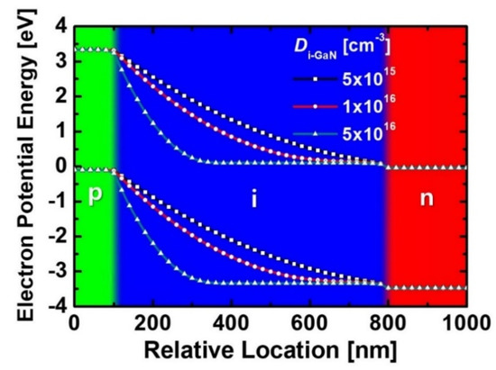 Energy band diagrams of the diodes with different values of Di-GaN. All the devices were designed with a Hp-GaN of 100 nm and a Hi-GaN of 700 nm. The Dp-GaN and Dn-GaN of the devices were 5 × 1017 cm−3 and 5 × 1018 cm−3, respectively.