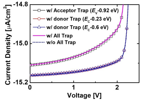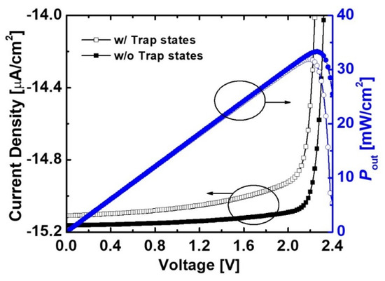 Figure 8 shows reverse current density and Pout of the irradiated diodes with and without the native trap states including donor and acceptor-like traps. The reverse current density was significantly degenerated by the trap states. This result means that the trap-assisted recombination was caused by the native defects in the GaN material. As a result, the Pout of the device with the trap states was lower than that of the device without the trap states. We confirmed the effects of individual traps on current characteristics of the irradiated devices. As a shown in Figure 9, the impact of acceptor-like trap states was stronger than that of donor-like trap states. This result proved that the acceptor-like trap states represented the dominant factor for the recombination.