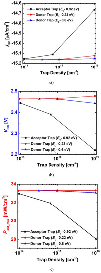 In addition, we investigated the effects of trap density on JSC, VOC, and Pout_max. As the trap density increased, the performances were totally degenerated by the acceptor-like trap state, as shown in Figure 10. The donor-like trap states reduced the JSC less than the acceptor-like trap state. While the donor-like trap states (EC-0.6 eV) slightly decreased the VOC, the shallow donor-like trap states (EC-0.23 eV) increased VOC. As a result, the Pout_max was unaffected by the shallow donor-like trap states (EC-0.23 eV). It is important to reduce the acceptor-like traps to improve the conversion efficiency of the betavoltaic cell.