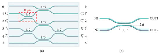 Figure 1a shows the schematic configuration of the photonic quantum chip composed of one H gate and one CNOT gate. The H gate (red dashed box) is a balanced directional coupler (DC), and the CNOT gate (the rest of the whole chip) is based on our previous work [] but with improved symmetry in circuit design. The left represents the input ports (0–5) and the right the output ports (0′–5′). The power reflectivity is marked on each DC, defined by the ratio of the output power from OUT1 to the total output power of a DC where the laser is launched into IN1 as shown in Figure 1b. The symmetry of the DC guarantees that the same relations hold when light is launched into port IN2, by simply inverting the two indices. There are three DCs with reflectivity of 1/2 and three DCs with reflectivity of 1/3. The control qubit (target qubit ) is encoded via spatial paths () and (). The remaining two paths are ancillary vacuum modes to complete the network. The H gate in this circuit represented by a DC is indeed a Hadamard-like gate as shown in Reference [], where is the standard Hadamard gate. They are equivalent up to local rotations, so we still use H gate for description in this article. When a single photon is input to path () representing the logic state (), the state will be unitarily transformed by the H gate to generate a superposition state (). The rest of the chip is a path encoded probabilistic CNOT gate. In the CNOT gate, when the control qubit is in logic state , the target qubit will flip from initial logic state () to opposite logic state (). However, when is in logic state , the logic state of remain unchanged. When one photon from and the other photon from are mixed in the central DC with reflectivity of 1/3 simultaneously, they will undergo a partial bunching effect and get a phase shift due to Hong–Ou–Mandel (HOM) interference of indistinguishable photons [,]; and this phase shift will change the output state of Mach–Zehnder (MZ) interferometer connected by paths and .