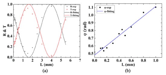 Experimental reflectivity and transmission of fabricated DCs. (a) Measured reflectivity R and transmission T of the DCs with different interaction length L at fixed interaction distance d = 8 μm as well as fitting curves for R and T. (b) Fitting for linear relation between coupling phase and interaction length L ranging from 0–1 mm.