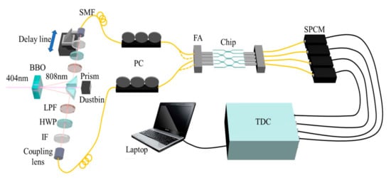 For the quantum characterization of the selected chip, we inject the time-correlated photon pairs into the chip and measure the coincidence counts of output photons. The experimental setup of the quantum characterization system is shown in Figure 4. The 808 nm dual photon pairs were generated by pumping a 0.5 mm thick beta-barium borate (BBO) crystal using 140 mW, 404 nm CW laser (ECL801, Uni Quanta) through Type-I spontaneous parametric down-conversion (SPDC) process. The photon pairs are divided into two parts and deflected by small prisms. After passing through long pass filter (LPF), half-wave plate (HWP), interference filter (IF), photons are collected by coupling lens into single mode fibers (SMFs). The LPF from 650 nm is used to remove the scattering 404 nm pump light, and the IF with 3 nm bandwidth is used to ensure good spectral indistinguishability. The HWP and the fiber polarization controller (PC) can control the polarization state of photon in fiber to maintain V polarization. One way is inserted into a delay line to control the relative arrival time of two photons to ensure the temporal indistinguishability. The photons are injected into the chip through 4-channel input fiber array (FA) with the same 127 μm spacing and then collected from the chip to the output fiber array. After that, the output photons are detected by single photon counting modules (SPCMs) (Excelitas, SPCM-800-14-FC) and conveyed to the Time to Digital Converter (TDC) (ID800, IDQ) to conduct the coincidence counting of the output photon pairs.