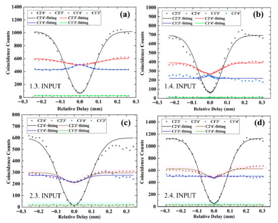 By scanning the relative delay between two input photons, we can get coincidence counting curves for four kinds of output-photon combinations after post-selection. As shown in Figure 5a, when the input-photon combination is (1,3), the interference curve of output-photon combination (2′,4′) shows a HOM dip at interference point, where the relative delay is zero and the corresponding coincidence counts reduce to zero. Its HOM interference visibility is about 98.5 1.2% with accidental coincidence counts subtracted. However, the interference curves of output-photon combinations (2′,3′) and (1′,4′) slightly change, and their coincidence counts at interference point get close to each other. In their interference curves, the occurrence of small dip or peak is due to the deviation of reflectivity for DCs and difference of internal phase between two arms of the MZ interferometer in the fabricated photonic circuit. The coincidence counts of the remaining output-photon combination (1′,3′) are close to zero. This represents that the post-selected output-photon state is a path-encoded entangled state: