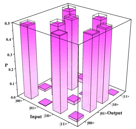 Compared with our previous work of path encoded CNOT gate [], the success of this work depends not only on the high interference visibility but also on the equal probability distribution of two terms in the entangled state (Equations (2) and (3)), which requires tougher fabrication. For each input-photon combination, we normalize the coincidence counts for each output-photon combination with accidental counts subtracted to calculate their corresponding probability. As shown in Figure 6, the probabilities of each computational-basis output for each computational-basis input are represented by the height of the filled pink bars, and the height of empty bars stands for the theoretical value. The reconstructed truth table of the chip coincides very well with the theoretical one and the average fidelity of the fabricated chip is as high as 98.8 0.3%, which is also higher than 91.2 0.2% in reference [].