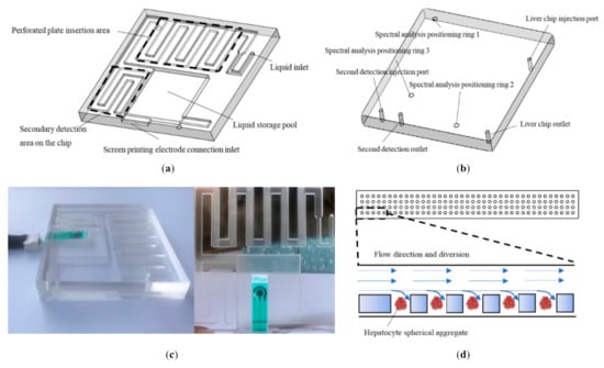 Due to the complex liquid microenvironment and microstructure of liver are complementary to microfluidic chips, which require less liquid, high throughput and integration [,], a microfluidic device is considered as a critical and reliable platform for drug screening research []. Therefore, scholars and organizations have conducted extensive research on liver chips based on microfluidic control in recent years [,,]. Yosuke et al. proposed a microfluidic cell culture device that mimics the structure of liver tissue. The hepatocytes cultured in a two-dimensional double-row self-organize in a specific reactor and form a cord-like structure (hepatic cord), which realizes the function of the bile duct to the secretion of bile collection, and proves that a two-dimensional model can have better simulation to partial liver function []. In addition, Ho et al. formed different electric field strengths on the chip based on dielectrophoresis technology. The pearl chain structure formed by the mixed culture of hepatocytes and endothelial cells can better simulate the cord-like structure of the liver []. However, the limitation of two-dimensional culture makes it impossible for non-parenchymal cells such as liver cells and hepatic stellate cells to construct a microenvironment similar to that of cells in the human body. At the same time, the two-dimensional cultured tissue model and the human liver model have large physiological differences and physical environment differences, so it is impossible to accurately predict liver metabolism and drug screening. Although most researchers focus on the construction of liver models [,], more and more people realize that the real-time monitoring system of liver chips can quickly reflect the influence of drugs on the liver state, and is more conducive to accurate drug screening. Danny et al. allowed continuous measurement of the electrochemical data of glucose and lactate in the liver chip system through a computer-controlled microfluidic switchboard []. Zhang et al. integrated the physical sensor and electrochemical sensor with the liver chip to realize the automatic monitoring of the biophysical and biochemical parameters of the liver chip []. However, the monitoring time of these sensors is relatively short, and the integration of these sensors with the liver chip is difficult. The light transmittance of the chip is not fully utilized, and real-time and effective electrochemical and optical monitoring cannot be achieved.