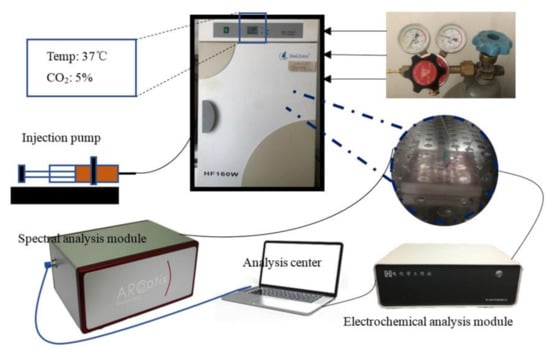 Then, according to the liver chip and monitoring system based on microfluidic technology as shown in Figure 2. At a flow rate of 200 μL/h, the DMEM medium for culturing liver cells was injected into the liver chip through a syringe pump and flowed out to the collection dish through the liver chip outlet, keeping 5% CO2 evenly and slowly passed into the incubator. At the same time, a blank cultured liver chip was placed in the incubator as a control group. It was injected at the same flow rate and was the same medium. When a certain incubation time was met, the liver chip and the blank control group were, respectively, connected to the spectrometer and electrochemical workstation to measure the spectrum and impedance. Configure the software in advance to shorten the experiment time and reduce pollution. After the liver cells were planted on the chip using a pipette, 12 h later, after the chip environment was stabilized, the first day’s spectral data and impedance data were recorded. Then the experiment was repeated until the fifth day.
