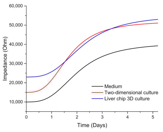 In this study, we measured impedance using three electrodes (working, reference and counter electrodes) to monitor cell growth in real time. After the chip was perfused with cells and placed in the cell incubator for 12 h, the screen-printed electrode was connected to the CHI600E electrochemical workstation for electrochemical impedance measurement. The initial settings were InitE (V) = 0.5 V, HighE (V) = 0.5 V, LowE (V) = −0.5 V and Sensitivity (A/V) was set to 1 × 10−6, and the scanning speed was 0.1 V/s. As shown in Figure 3, the impedance of the blank culture medium control chip, two-dimensional liver cells cultured in the clean dish, and three-dimensional spherical liver cells cultured in the designed liver chip were respectively monitored in real time from day one to day five. The results showed that as the number of days increased, the cells continued to grow. The impedance value of the cells under the three conditions became larger and the culture medium had the lowest impedance value, while the impedance value of the liver cells cultured on the liver chip exceeded that of two-dimensionally cultured liver cells on the fourth day, and stabilized on the fifth day.