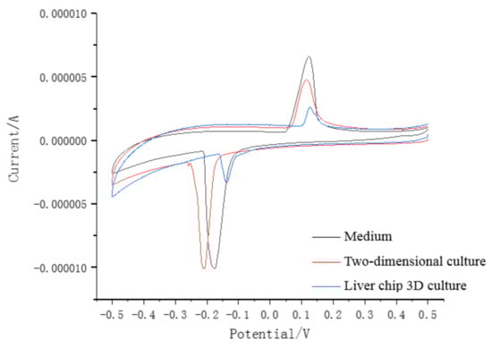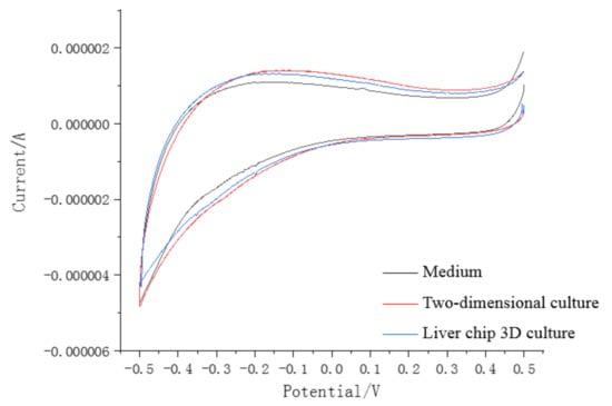 Measuring again on the third day, the initial settings were InitE(V) = 0.5 V, HighE(V) = 0.5 V, LowE(V) = −0.5 V and Sensitivity(A/V) was set to 1 × 10−6. The scanning speed was 0.1 V/s, from which the data shown in Figure 5 was obtained. It can be analyzed that the medium resistance of the hepatocytes derived from two-dimensional culture was the largest in the culture dish, followed by the data of the liver chip 3D culture. The resistance of the medium was the smallest. It can be inferred that the ion content in the solution increases through life activities in the experimental platform with cells cultured on the third day. The two-dimensional cells inoculated in the Petri dish on the third day were more active, because the liver cells cultured in 3D spherical aggregates on the liver chip need more time to grow and be stable to show stronger liver function than the two-dimensional cultured liver cells.