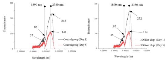 In order to further confirm that the liver cells cultured on the liver chip have stronger liver functions, the liver cells cultured on the liver chip and the control group were analyzed by near infrared spectroscopy. For the control group, the model was the same as the liver chip, but the porous cell plate did not contain printed liver cells and the liquid flow rate of the syringe pump was the same as the liver chip. Near-infrared spectrum data were recorded on the first day and the fifth day of culture for the control group with the only medium, respectively, which has the most considerable difference at the wavelength of 2380 nm as shown in Figure 6. Similar rules were observed in the 3D liver chip’s near-infrared spectra, but there was still no significant difference in the near-infrared band. The first day of the control group’s spectrum is located in the 2380 nm band with a transmittance of 243 and a value of 82 at the small peak (1890 nm). On the fifth day, the 2380 nm band’s value was 141 and the corresponding transmittance of 1890 nm was 57. On the first day, the value of the 3D liver chip in the 2380 nm band was 252, the small peak (1890 nm) was 85 and the value of the two bands was 114 and 35, respectively, on the fifth day. The light transmittance of these two bands for the control group decreased to a certain extent, but the data is not obvious. It is planned to use the absorbance spectrum for follow-up test observation.