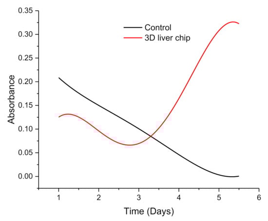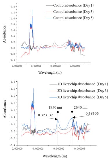 The absorbance measured from the first day to the fifth day with the wavelength of 1950 nm and the comparison between the control group and the 3D liver chip was shown in Figure 7. The absorbance of the control group decreased with the increase of days, while the absorbance measured in the 3D liver chip reached the lowest on the third day and increased with the increase of days and stabilized on the fifth day. As shown in Figure 8, it can be found that the medium has a high absorption value in the wavelength range of 700 to 800 nm, and this feature can also be used in the 3D liver chip. It can be concluded that the main cause of this part of the change was the nutrients in the medium. At the same time, it can be observed that in the wavelength range of 1000 nm to 2800 nm, the absorbance value of the data measured on the 3D liver chip on the third day was generally lower than that measured on the first day. The cell condition was not good when the cells were printed on the liver chip on the first day, but there were still some secretions and metabolites between the cells and the medium, so the absorbance spectrum of this band was slightly higher than that on the third day. After printing, the liver cells slowly recover their ability to grow and proliferate on the chip, and gradually enhance the simulation of the in vivo microenvironment. Therefore, the absorption value of the corresponding wavelength band on the fifth day was more significant than that of the liver chip on the third day. There were two absorption peaks at 1950 nm and 2640 nm, and the absorption values were 0.323132 and 0.38306, respectively. The absorption spectrum data observed on the first day, the data of the control group and 3D liver chip were the same. This situation should also prove the sudden change of the cell culture environment on the first day of printing cells. Therefore, it is difficult for cells to quickly restore normal cell activity and physiological cell morphology, so the experimental data of the control group and the experimental chip group have fewer fluctuations. Therefore, the designed liver chip can meet normal liver cells’ requirements to grow, proliferate and maintain certain life activities in vitro. Simultaneously, it can perform electrical impedance and spectral data recording on the chip, so that microfluidic technology can be used to design an organ chip research platform with high integration, high sensitivity and good simulation of human microcirculation.