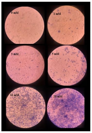 The concentration increases from left to right from top to bottom. When cultured with 0 mM paracetamol for four hours, it can be observed that the cultured liver cells were all translucent, maintain good morphological characteristics and have a high survival rate. After culturing with 1 mM paracetamol for four hours, a few dead cells can be seen in the sampling area that is stained dark blue, the number of apoptotic cells is still small, and the cell membranes of dead cells lose their inherent selective permeability. So, it will be stained by foreign biological stains. The subsequent 3 mM, 5 mM paracetamol cell culture medium, and samples with lower concentration gradients changed linearly, and the cells stained blue by 0.4% trypan blue stain gradually increased. When the cultured paracetamol concentration reaches 10 mM, a significant increase in apoptotic cells can be observed, which can prove that the drug concentration has exceeded the metabolic range that the liver cells can withstand. The internal microenvironment of the cultured liver cells has been destroyed. At this time, the number of surviving cells has significantly been reduced. At a concentration of 20 mM, it can be seen that it is challenging to observe unstained cells, and the cells undergo a large area of apoptosis. Therefore, as the concentration of paracetamol increases, the number of apoptotic cells also increases. At the same time, there are mutation points in the range of 10 mM, and according to the activity test of cells cultured at a concentration of 20 mM, it can be seen that the metabolic capacity of liver cells cultured on the liver chip under study is about 10 mM.