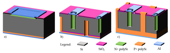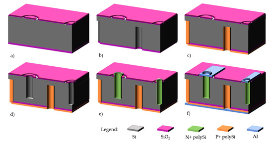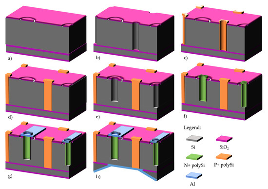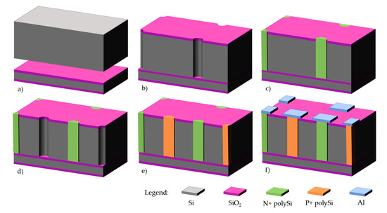 Process starts on 200–300 μm high resistivity p-type silicon wafers, with field oxidation and p-stop definition on the front side (Figure 11a). Then, aluminum is deposited on the backside to act as a DRIE mask. Once the aluminum and field oxide etched, p+ electrodes are defined by DRIE (Figure 11b). This is not a through-wafer etching: the p+ electrodes should be etched down to 20–30 μm from the other side of the wafer for optimum electrical performance. The etch depth is regularly controlled with a test wafer which is cleaved for microscope and Scanning Electron Microscope (SEM) inspection of the electrodes. After stripping of aluminum from the backside and appropriate cleaning, a 1-μm polysilicon layer is deposited by LPCVD and doped with BN (boron nitride) wafers on the backside (Figure 11c). In this technology, there is no need for filling the p+ electrodes since the other DRIE process will occur on the opposite side. The p+ polysilicon is protected from the subsequent n+ doping by a 200 nm grown oxide. Then, this process is repeated on the front side with POCl3 source for n+ doping, and polysilicon pads are defined on the front side to ensure a good electrical contact with metallization (Figure 11d,e). Finally, aluminum is sputtered and patterned, followed by a 400 nm-nitride/400 nm oxide passivation deposited by PECVD. For the IBL production, backside metal had to be patterned to define alignment marks, and a backside passivation was also added.