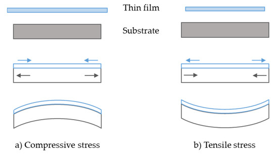 Almost any films deposited or grown on a wafer will be in a state of stress, be it because of the difference between deposition and room temperature (thermal stress), or from growth or deposition conditions (intrinsic stress). As stated by Doerner and Nix [11], “stresses in thin films on substrates are produced by processes which would cause the dimensions of the film to change if it were not attached to the substrate.” Let us imagine that the thin film dimensions would be larger than the substrate if not attached to it (Figure 2a). Attached to the substrate, the thin film would tend to expand (buckling up, compressive state), creating a stress of opposite sign at the substrate surface, and the substrate will bend upwards in order to balance the bending moment which is produced by the stressed film [12]. In the opposite case, the thin film will tend to crack (tensile state) and the substrate will bend downwards (Figure 2b).