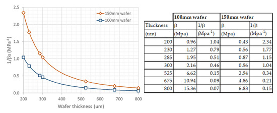 Variation of substrate parameter 1/βs with wafer thickness and values of βs for typical wafer thicknesses for 100 mm and 150 mm diameters.