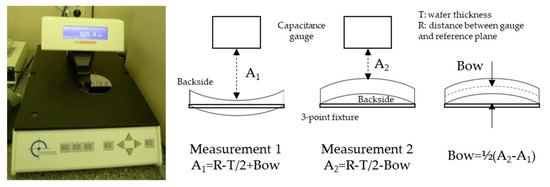 Wafer bow was measured at Microelectronics Institute of Barcelona (IMB-CNM) with the Proforma300 from MTI Instruments, subsidiary of Mechanical Technology Incorporated [16]. It is a simple, manual, capacitance-based, non-contact system which allows to measure wafer thickness, total thickness variation (TTV), and bow. It measures the capacitance between the gauge and the wafer, and therefore calculates the distance between both (sensing gap), and then the wafer thickness. Wafer bow is measured with a 3-point fixture, which defines the reference plane. The wafer is first measured backside up, then turned over, and measured again. From the two measured distances, bow is easily deduced (see Figure 5 below). This procedure gives the bow with the sign convention defined above.
