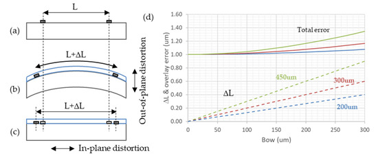 Effect of wafer bow on in-plane-distortion and overlay error (after [19]): (a) First alignment level on clamped wafer, with patterns separated by L; (b) deposition of a stressed layer, generating wafer distortion; (c) next alignment level on clamped wafer and in-plane-distortion; (d) in-plane-distortion and total overlay error (simple overlay error: 1 μm) as a function of wafer bow.