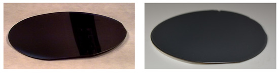 230 μm wafer after a not optimized boron diffusion doping (left) and 525 μm after a thick (~25 μm) aluminum sputtering (right) (courtesy of J. Montserrat, IMB-CNM, CSIC). Wafer deformation (warping) is clearly visible.