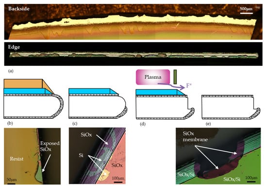 (a) Edge damage due to Deep Reactive Ion Etching (DRIE) observed from the etched side (backside) and the edge of the wafer; sequence of steps leading to the observed damage: (b) the resist does not cover the wafer surface to the edge, (c) silicon oxide is etched during definition of the DRIE mask, (d) exposed silicon is etched by F* radicals leaking form the plasma, and (e) final results: damaged edge.