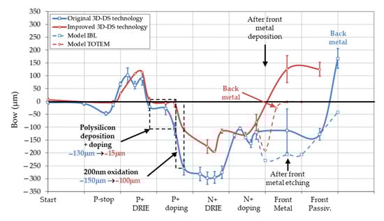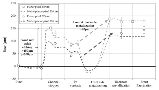 Before dealing with the more complex case of 3D technology, let us first examine a standard planar p-n pixel process on 100 mm diameter wafers with two different thicknesses (230 μm and 285 μm). Wafer curvature (see Figure 9) mainly originates from two definite process steps: field oxide etching on the front and backside to define the front and backside contacts (+150 μm), and metallization (+90 μm). In order to model the bow variation during the process, we assumed that bow from silicon oxide and aluminum originates from thermal stress only (see Equation (5)). At sufficiently high temperature, silicon oxide is viscous enough to relieve all internal stress, due to volume mismatch between silicon and its oxide, leading to a pure thermal stress between growth and room temperatures [25]. For aluminum used in metallization, thermal stress usually dominates residual stress because of the large difference in coefficient of thermal expansion between aluminum and silicon (substrates in our sputtering tools are not cooled) [26].