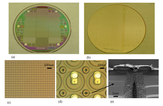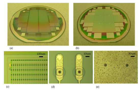 Front side (a) and backside (b) photographs of single-side SOI wafers. Pads from p+ electrodes are visible on the front side. View of RD53A 50 × 50 μm2 devices (c,d) and Scanning Electron Microscope (SEM) cross-section of p+ pad (e).