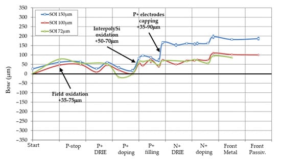 On Figure 16, bow variation during fabrication process on SOI wafers is drawn. We use SOI with buried oxide of 1 μm, handle wafer of 300 μm, but three different active silicon thickness: 150 μm (blue curve), 100 μm (red), and 72 μm (green). It is clear that stress issues are less critical than on double-side technology on standard 230 μm wafers, mainly because of the thicker wafers used (372–450 μm), which reduce consequently the wafer curvature.