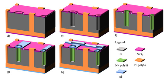 The process was completed at Stanford Nanofabrication Facility and starts with the fusion bonding of the active silicon n-type wafer to an oxidized support wafer to obtain a silicon-on-insulator (SOI) wafer (see Figure 10a). As this process was performed on n-type wafers, there were no need for p-spray, neither p-stop. Then, a 0.7 μm field oxide is grown and window for the n electrodes are defined by photolithography and etched in the field oxide (Figure 10b). The DRIE is performed following the Bosch process [29] with a 7 μm resist mask. Selectivity to resist is greater than 50 [1], diameter of electrodes is 11.5 μm, and electrodes are etched down the buried oxide (BOX). The electrode-doping process consists of two steps: first, polysilicon is deposited by LPCVD and afterwards phosphorus-doped with POCl3 source. The electrodes are then filled with polysilicon and polysilicon is etched away from both sides of the wafers. The same sequence is repeated for the p+ electrodes which are doped with a BBr3 source. Finally, aluminum-silicon alloy (Al/Si-1%) is sputtered and patterned on the front side.